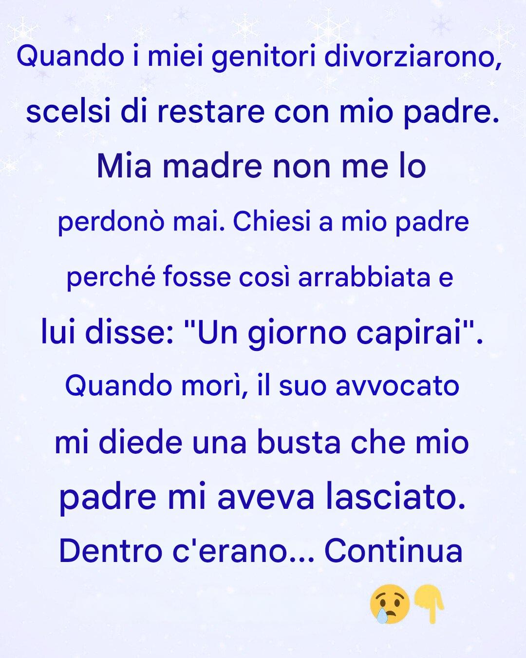 Ogni compleanno che perdeva, ogni telefonata brusca, ogni festività imbarazzante: ogni cosa creava un po’ più di distanza tra noi. Chiedevo a mio padre: “Perché è così arrabbiata con me? Cosa ho fatto di sbagliato?”. Lui mi scompigliava delicatamente i capelli e ripeteva ogni volta le stesse parole a bassa voce: “Un giorno capirai”.
